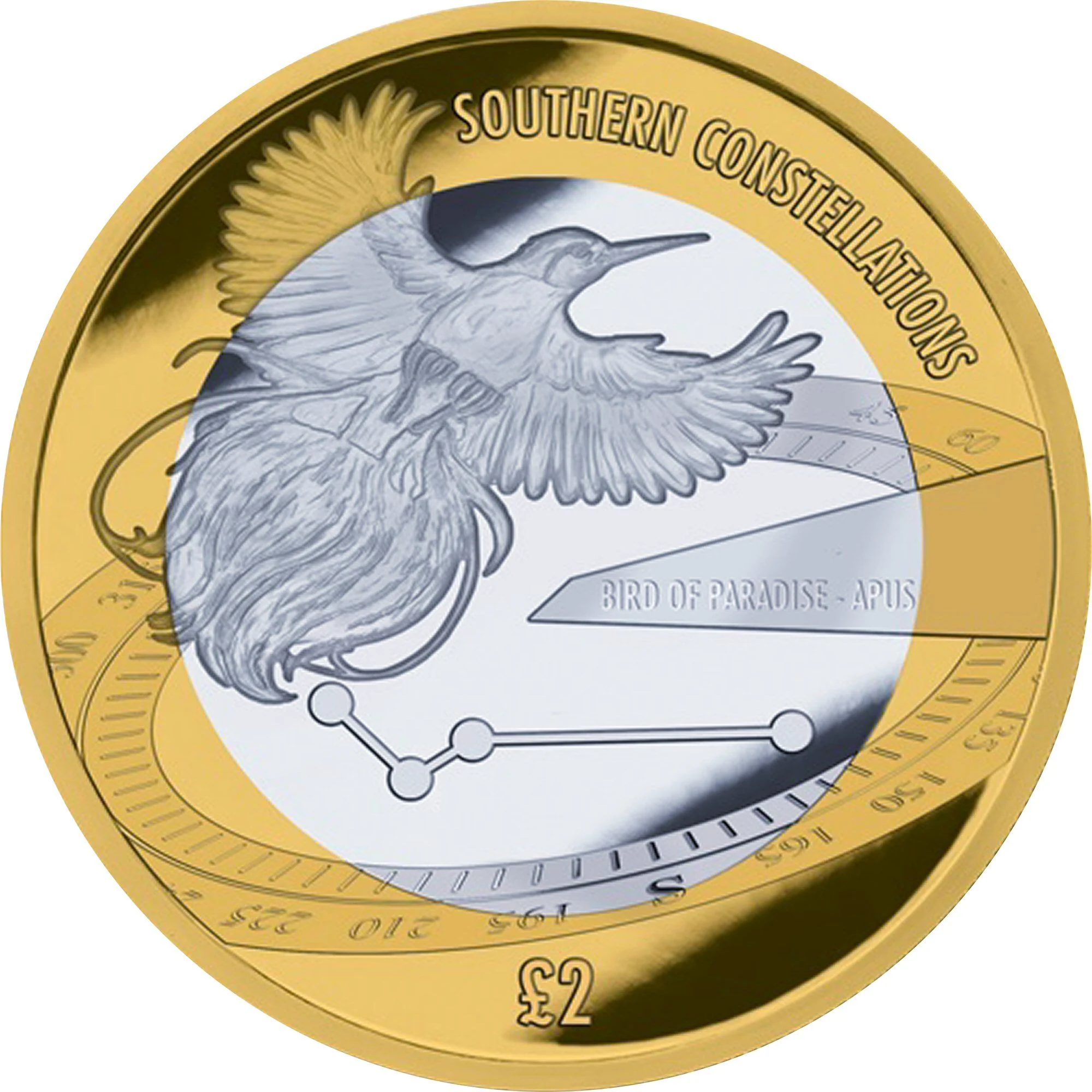 Apus constellation under a Bird of Paradise and an Antarctic compass.