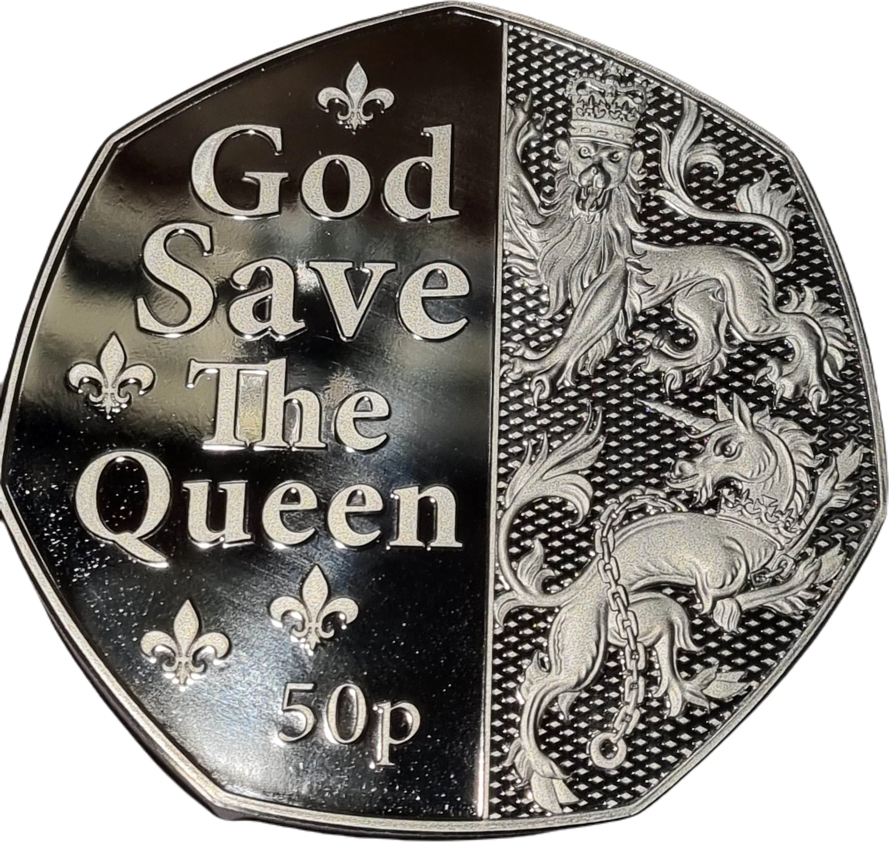 "God Save the Queen" with the Lion of England and Unicorn of Scotland.