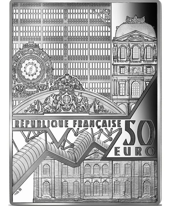 Architectural details of five Paris museums: Orsay, Louvre, Picasso, Rodin, and Pompidou.