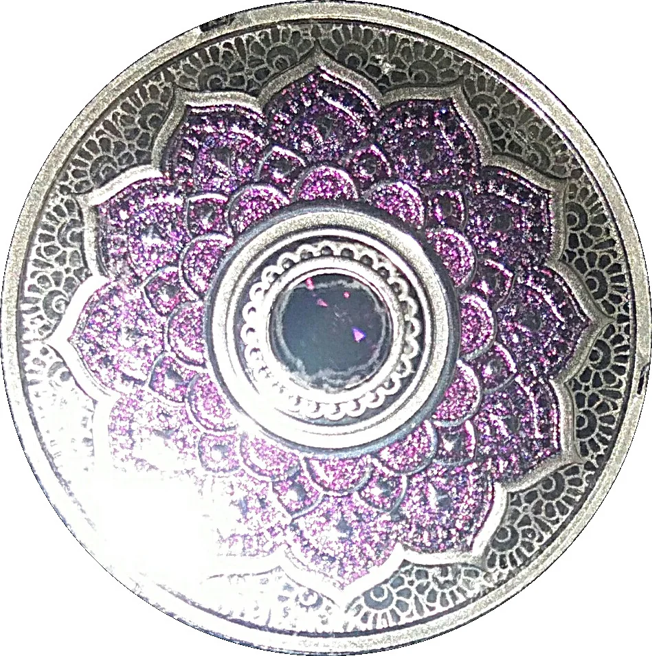 Henna-style mandala with a central amethyst crystal.