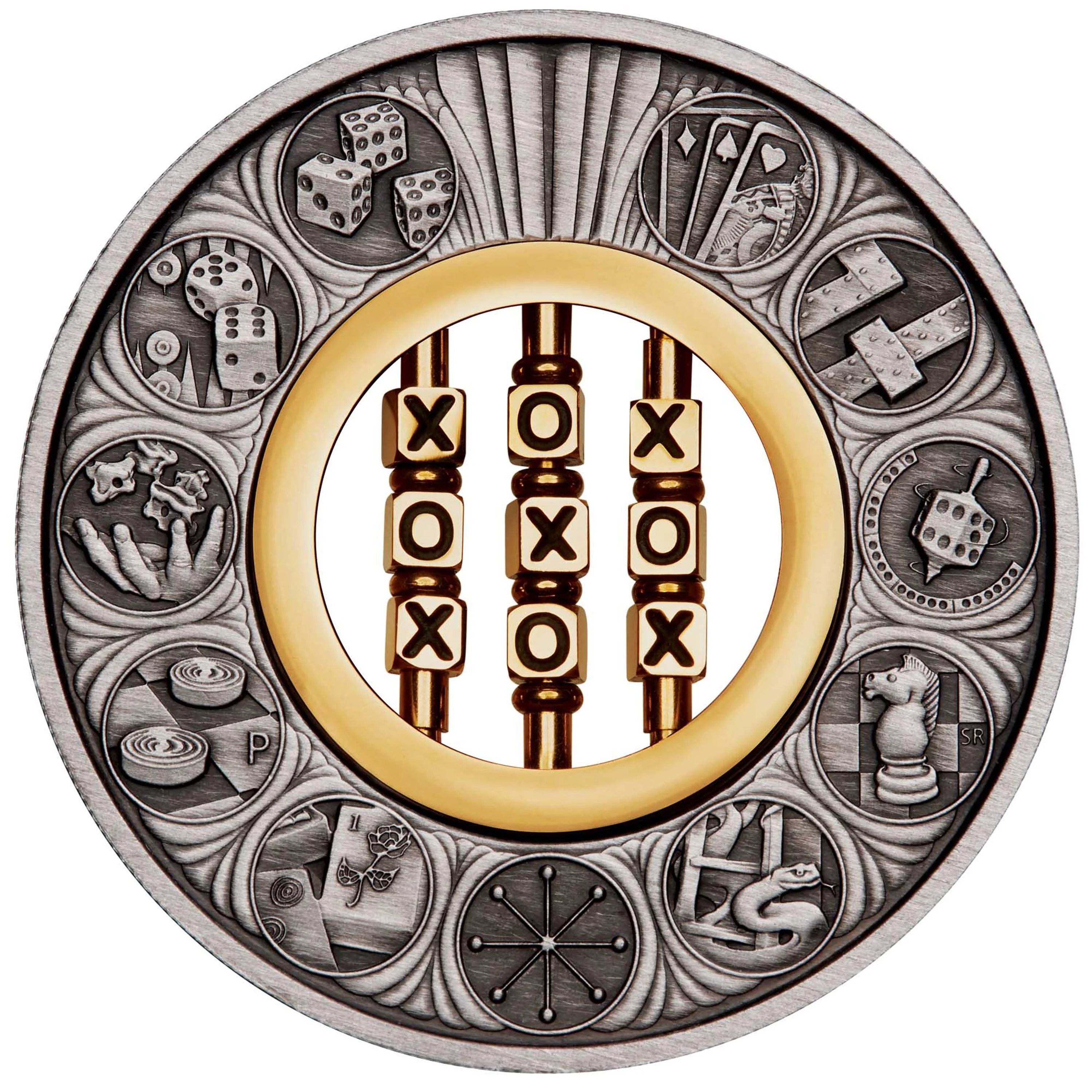 Game motifs include cards, dominoes, dice, chess, snakes and ladders, terni lapilli, mahjong, checkers, knucklebones, and backgammon. The coin's centre has a 24-carat plated steel insert of tic-tac-toe.