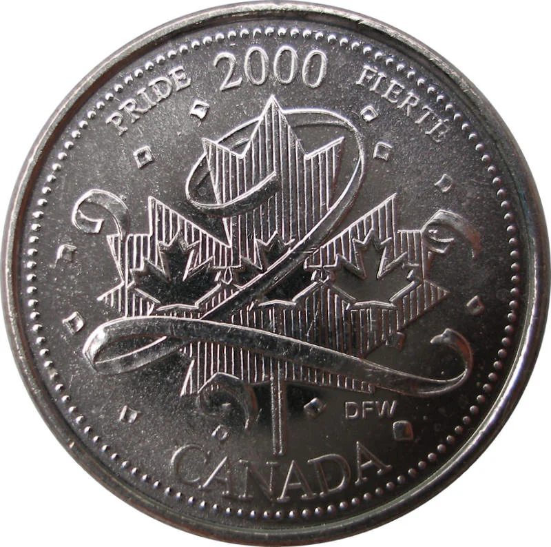 A maple leaf with a red ribbon and three small red leaves for 2000. "Pride" in English and French divides the date at the top and "Canada" at the bottom.