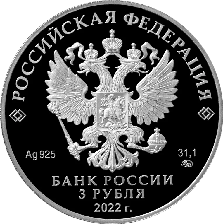 The obverse features the Russian coat of arms, inscriptions for "RUSSIAN FEDERATION" and "BANK OF RUSSIA", "3 ROUBLES", the year "2022", the metal's chemical symbol, fineness, mint mark, and fine metal content.