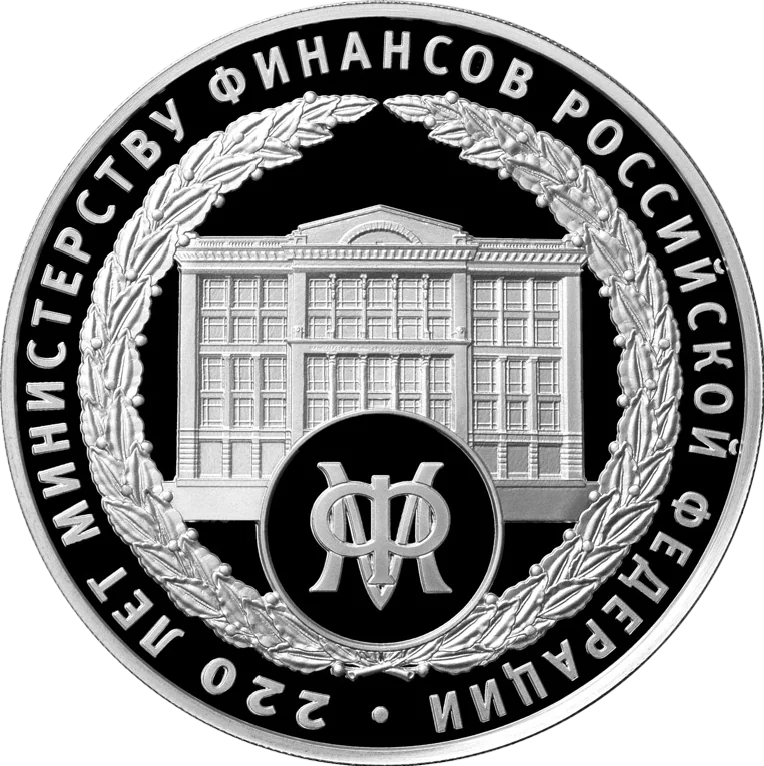 The reverse features the Russian Finance Ministry building and a laurel-wreathed fragment of its emblem, encircled by the relief inscription: "220 ЛЕТ МИНИСТЕРСТВУ ФИНАНСОВ РОССИЙСКОЙ ФЕДЕРАЦИИ".