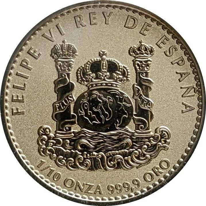 Two hemispheres crowned, flanked by the Pillars of Hercules, above a wavy sea.