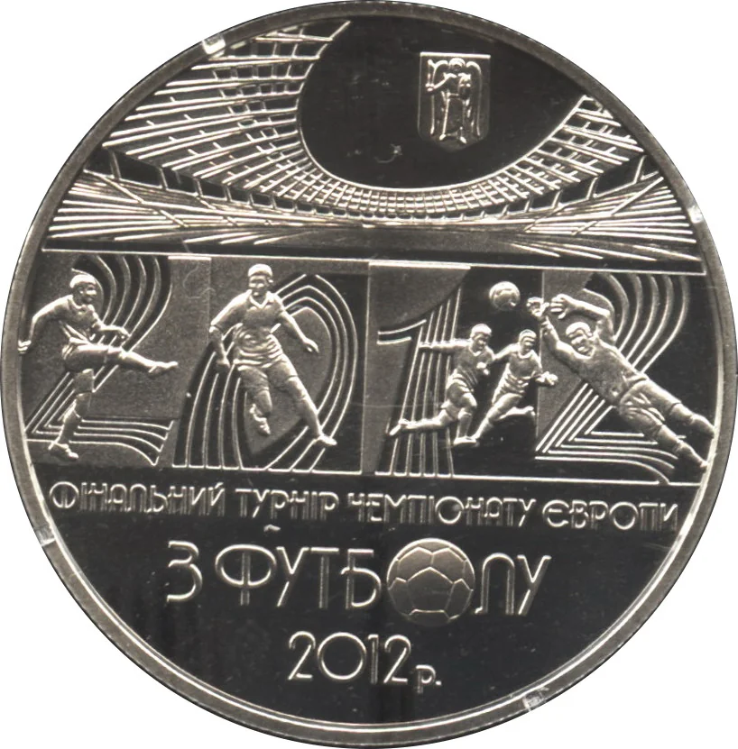Description: Ukrainian Small Coat of Arms above "НАЦІОНАЛЬНИЙ БАНК УКРАЇНИ." A map of Europe features Kyiv and Warsaw, overlapped by the UEFA EURO 2012™ logo. Left: years of previous tournaments from 1960. Right: face value "5 ГРИВЕНЬ 2011" and the Mint logo.