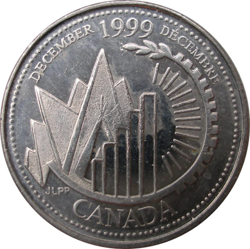The "This is Canada" design depicts the nation's landscapes, industries and cities in geometric shapes, encircled by "CANADA" and the bilingual date "DECEMBER 1999 DÉCEMBRE".