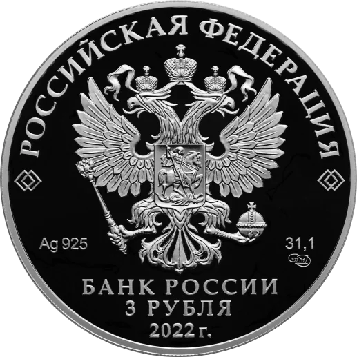 The obverse bears the Russian Federation coat of arms, inscriptions for "РОССИЙСКАЯ ФЕДЕРАЦИЯ," "БАНК РОССИИ," "3 РУБЛЯ," the year 2022, metal specifications, and the mint mark.