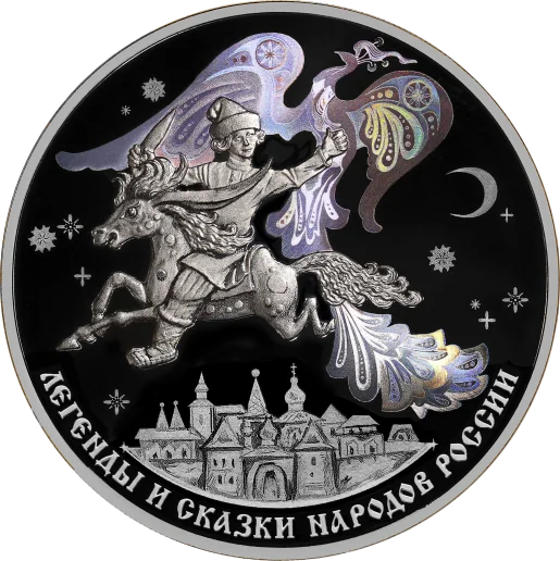 The reverse depicts Ivan riding Konyok Gorbunok, holding the Firebird, above a fairytale town. The relief inscription reads "ЛЕГЕНДЫ И СКАЗКИ НАРОДОВ РОССИИ." The Firebird features an iridescent microrelief, while the town, stars, and moon have a laser-matte finish.