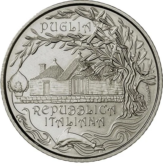 UNESCO World Heritage Sites—Alberobello's Trulli and an Apulian dry stone wall—flank an olive tree (right) and the Grottaglie Pumo (left). Below, stylized waves and a dolphin from ancient Taranto coins. Inscriptions: "PUGLIA" above, "REPUBBLICA ITALIANA" below, and the designer "M. BONIFACIO" on the right.