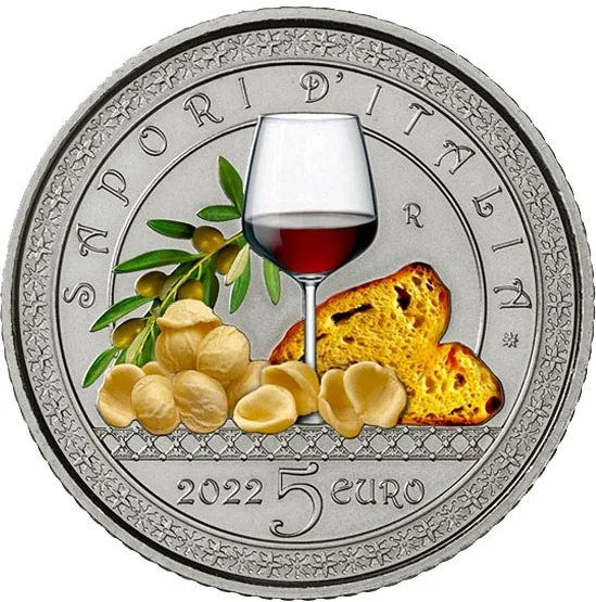 Apulian foods: Altamura bread, orecchiette, olives, and wine. Field decorations inspired by Romanesque fretwork from Sant'Elia's chair in Bari's Basilica of San Nicola. Above, the arched inscription "SAPORI D'ITALIA"; right, "R" (Rome Mint); below, "2022" and "5 EURO". Colour coin.