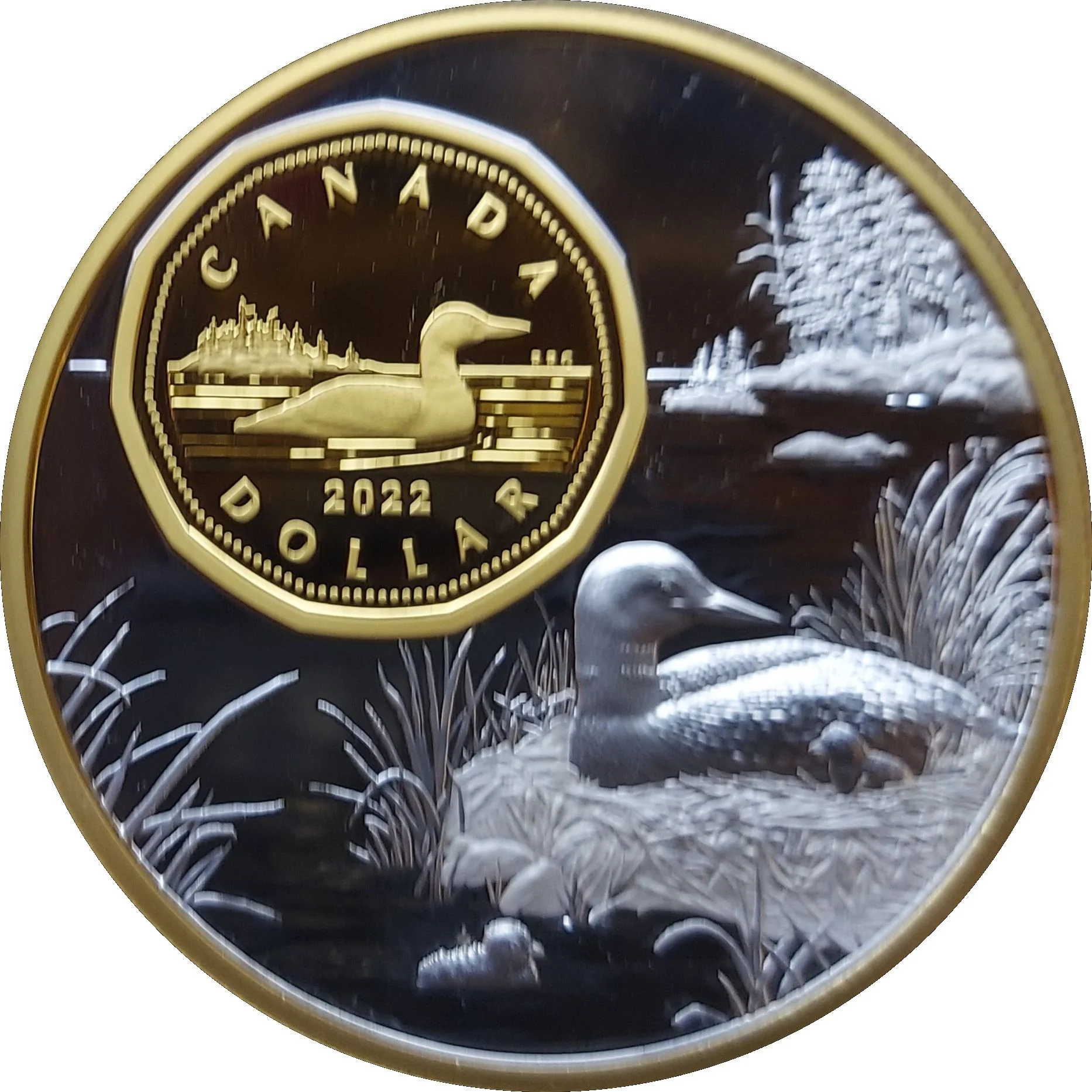 The reverse merges Robert-Ralph Carmichael's dollar coin design with an expanded scene by Claude Thivierge, depicting the solitary loon observing its family from a distance as the female tends to their chicks at the nest.