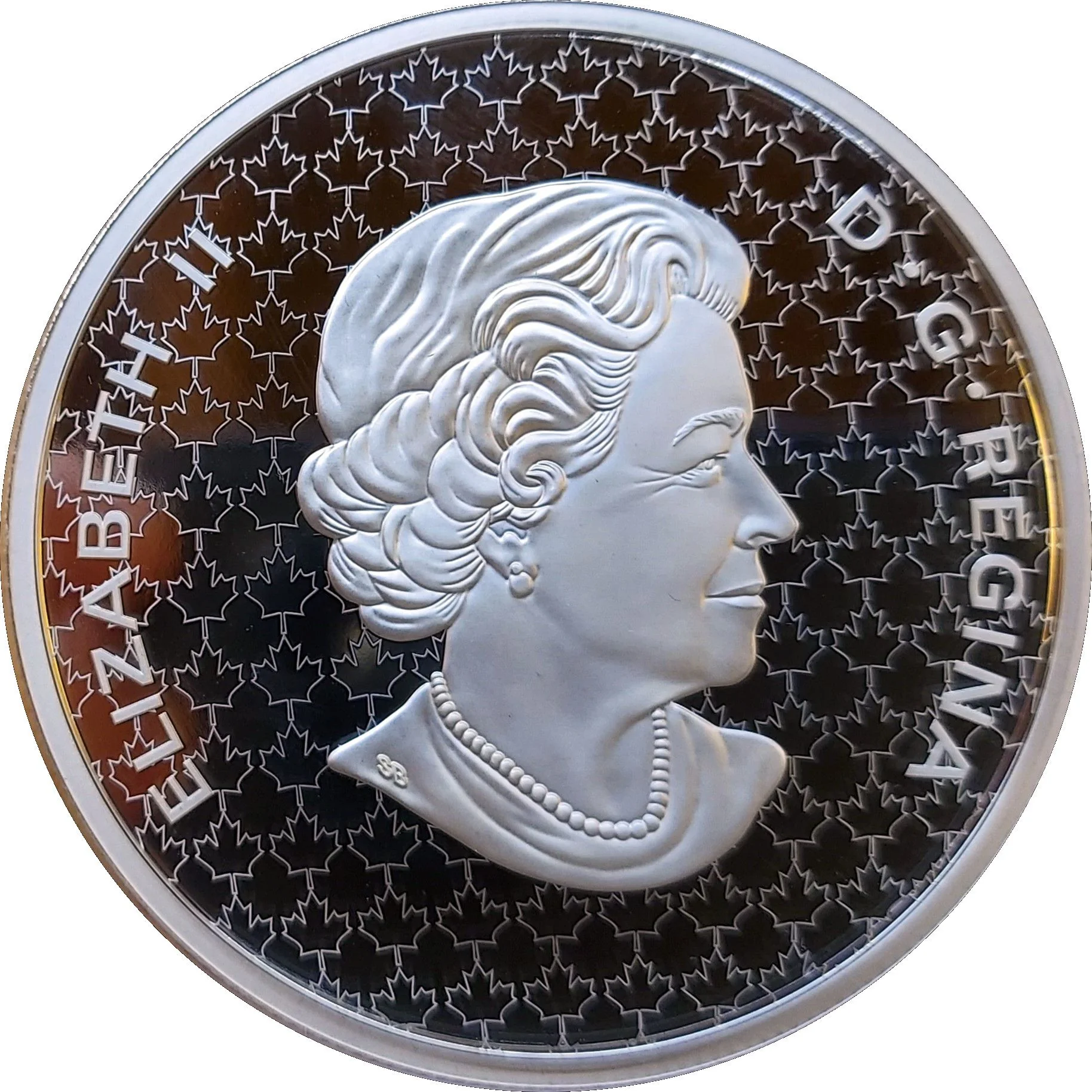 The obverse shows Queen Elizabeth II at age 77, facing right, wearing a necklace and earrings, against a background of maple leaves.