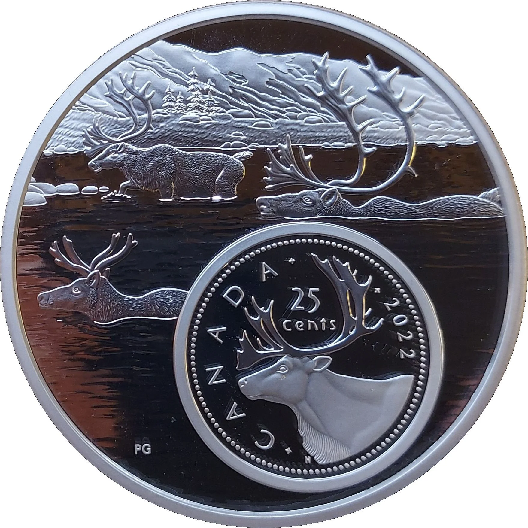 This reverse merges Emanuel Hahn's 25-cent design with Pierre Girard's expanded scene, depicting the iconic caribou swimming during a river crossing.
