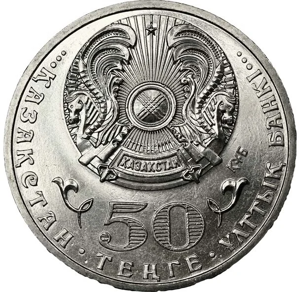 Description: Kazakhstan's State Emblem on an ornamental background, with the face value "50 ТЕҢГЕ" and national patterns, accompanied by the Kazakh legend "ҚАЗАҚСТАН".