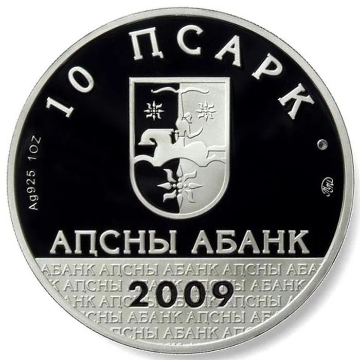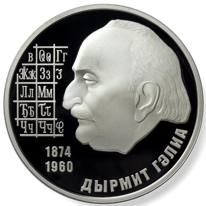 Portrait of Dmitry Gulia facing left, flanked by Abkhaz letters with dates beneath.