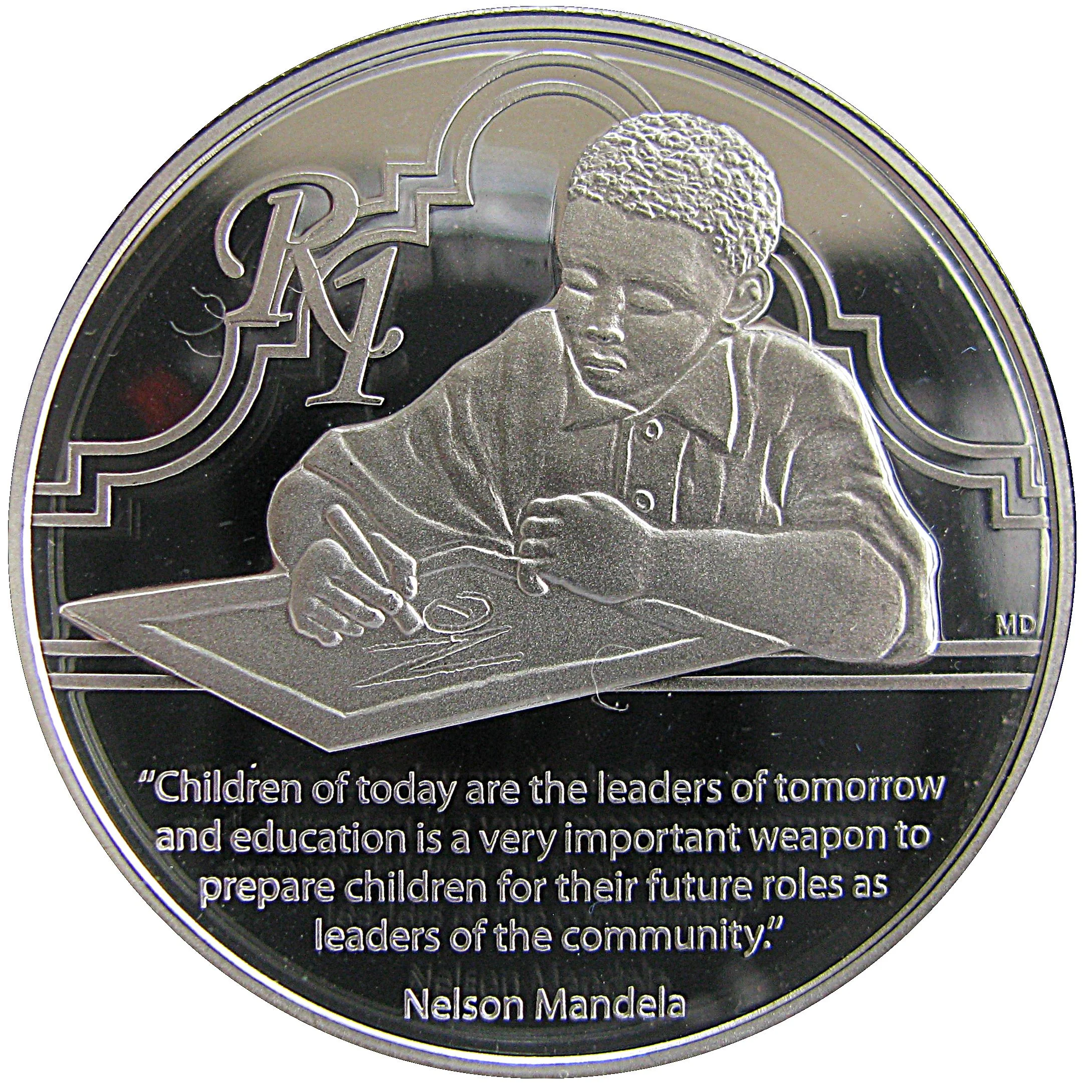 A child learning, writing, with a Nelson Mandela quote.