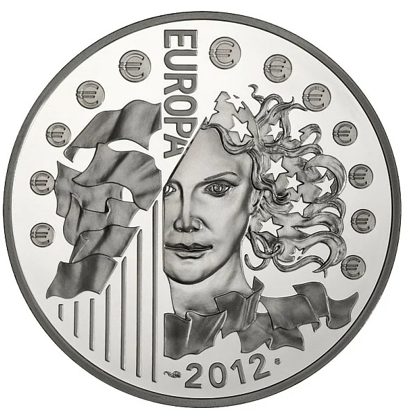 Portrait of Europa with stars in her hair, above an arc of 12 "€" symbols. To her left, European flags on mats.