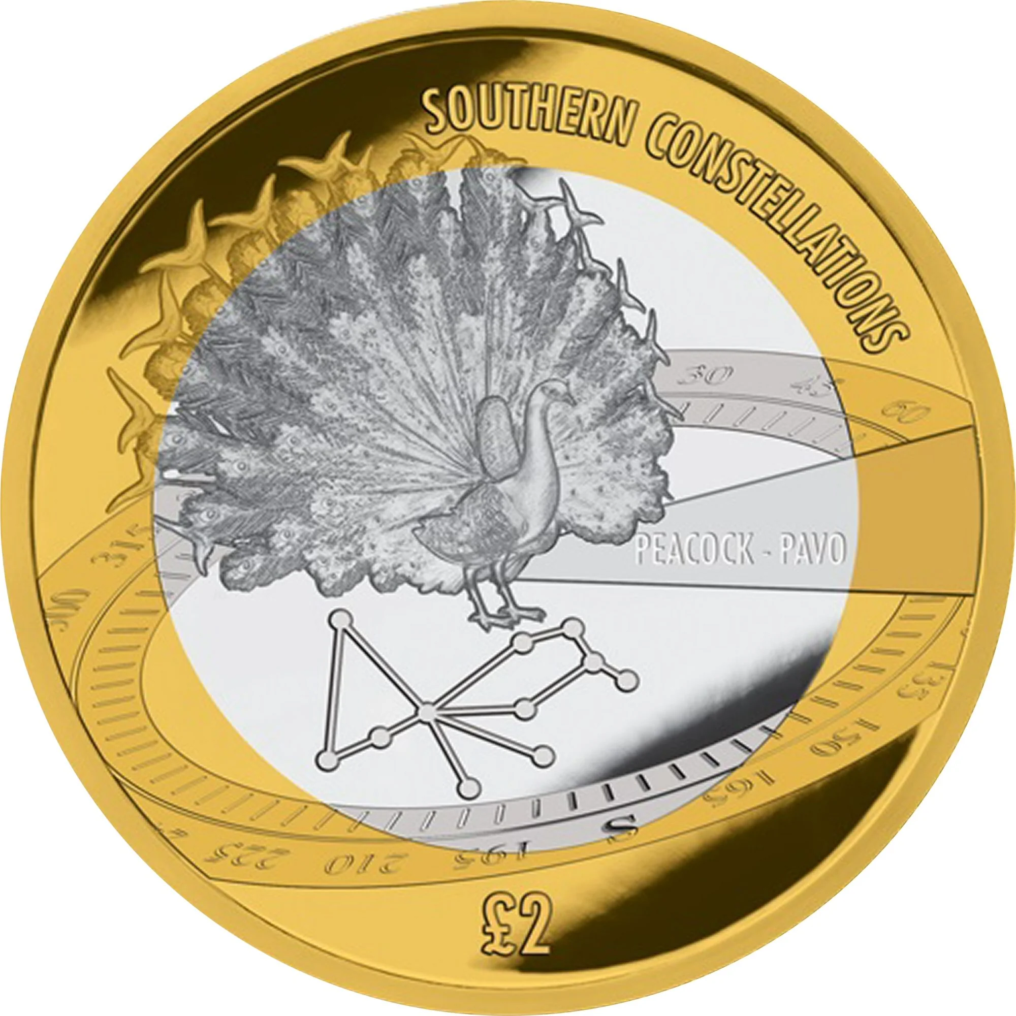 Pavo constellation under a peacock and an Antarctic compass.