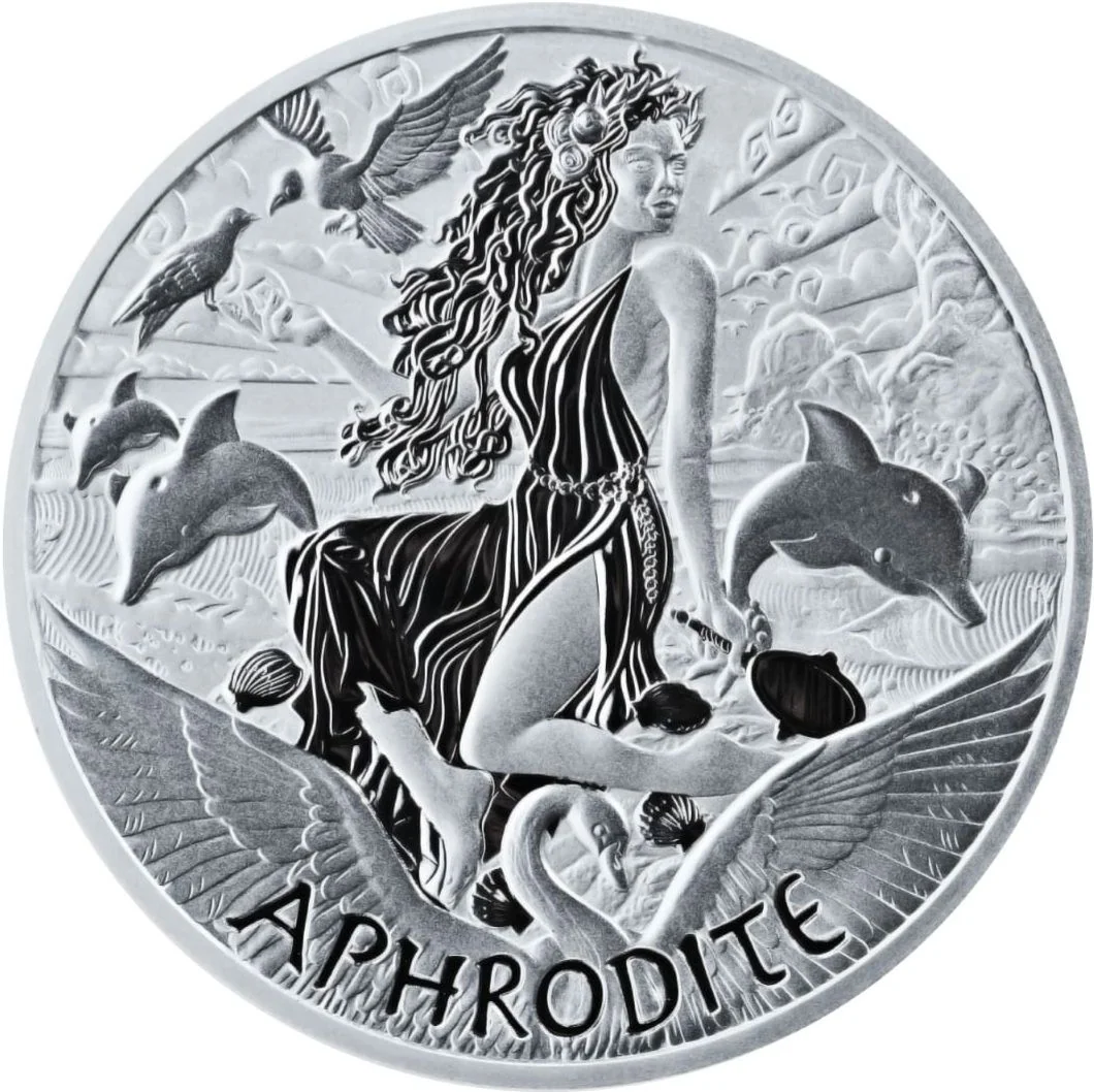 Aphrodite sits on the beach at her namesake rock, holding a mirror and with a dove on her hand. A swan, three dolphins, the ocean, and clouds surround her.