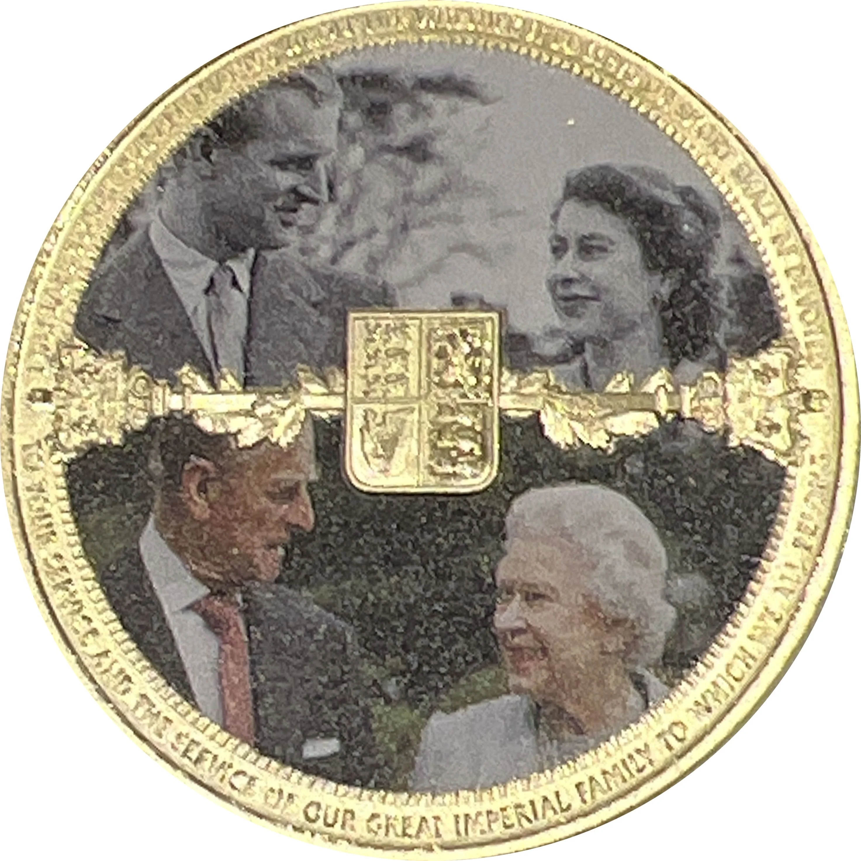 Description: Top: Princess Elizabeth (later Queen Elizabeth II) and Prince Philip on honeymoon at Broadlands. Bottom: The couple recreates the pose for their Diamond Anniversary. Philip, her "strength and stay," was the longest-serving consort. The design features a sceptre, oak sprigs, St Edward's Crown, the Royal Arms shield, and a 1947 pledge inscription.