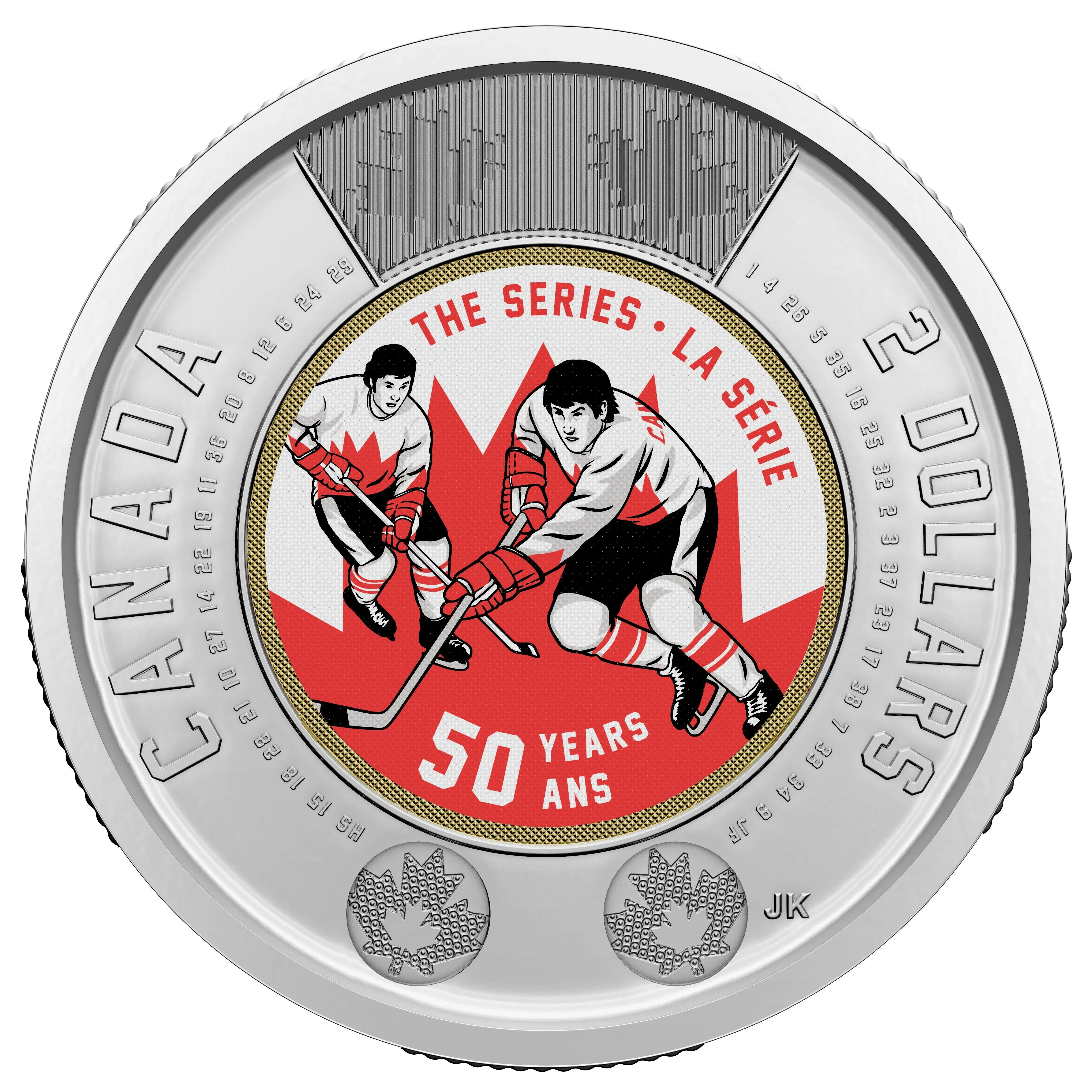 Joel Kimmel's reverse design depicts two Team Canada hockey players against the iconic maple leaf. It includes the text "THE SERIES LA SÉRIE" and "50 YEARS ANS," with the outer ring featuring coaches' initials and players' jersey numbers.