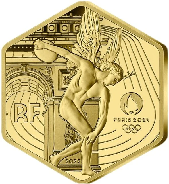 Freedom's discus thrower before the Arc de Triomphe and an Olympic stadium. Paris 2024 logo at right.