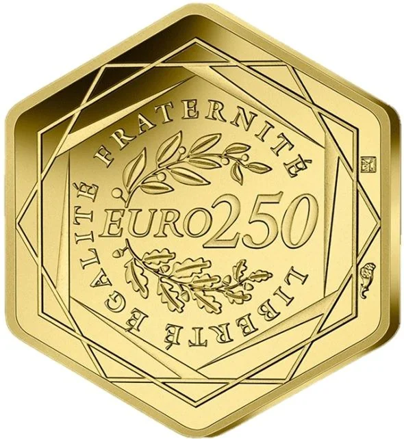 A laurel and oak branch flank the face value, encircled by the French motto and three hexagons.