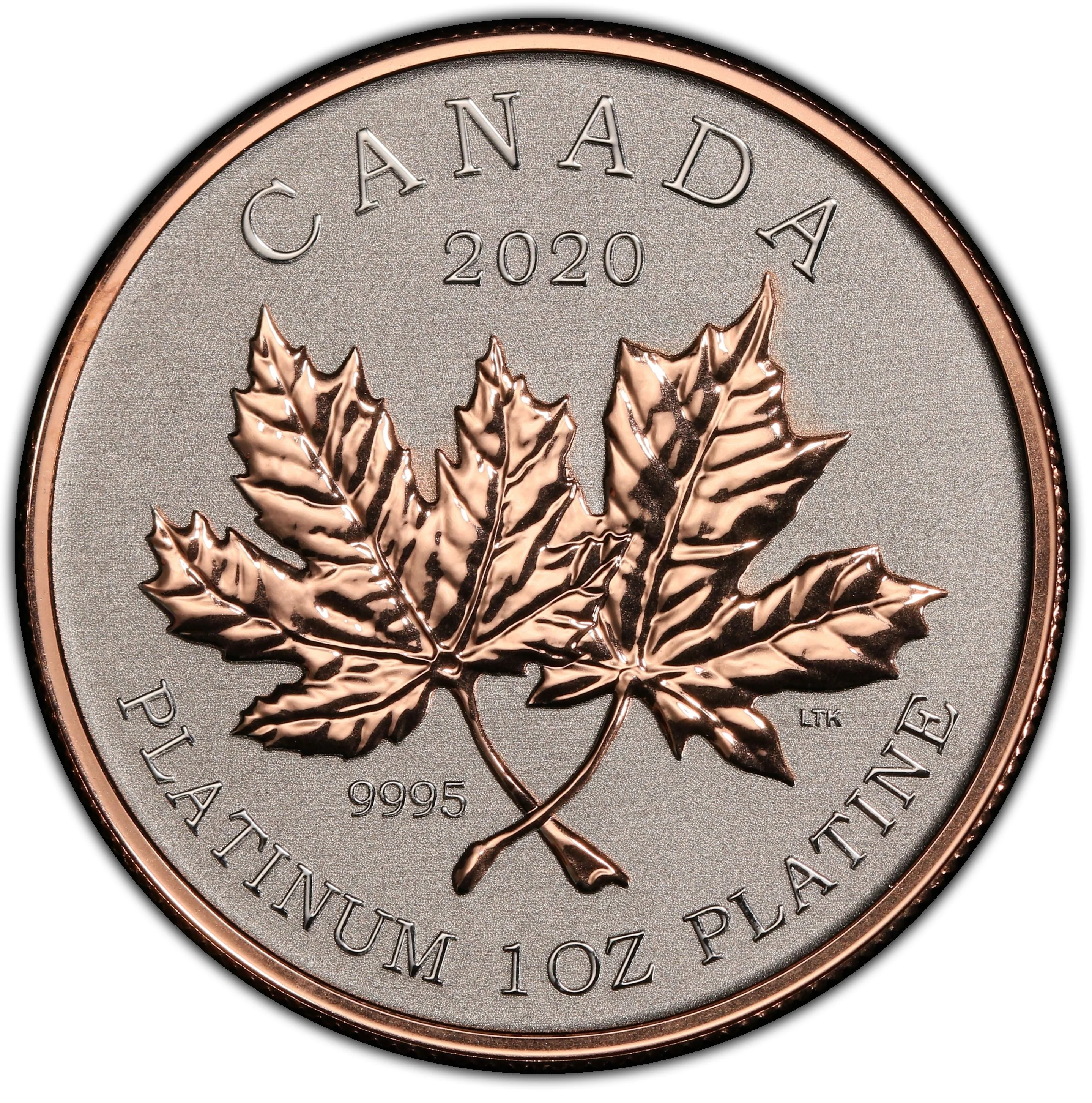 Lisa Thomson Khan’s reverse-proof maple leaf portrait features two stems-crossed leaves, with delicate engraved veining accentuated by selective rose gold plating.