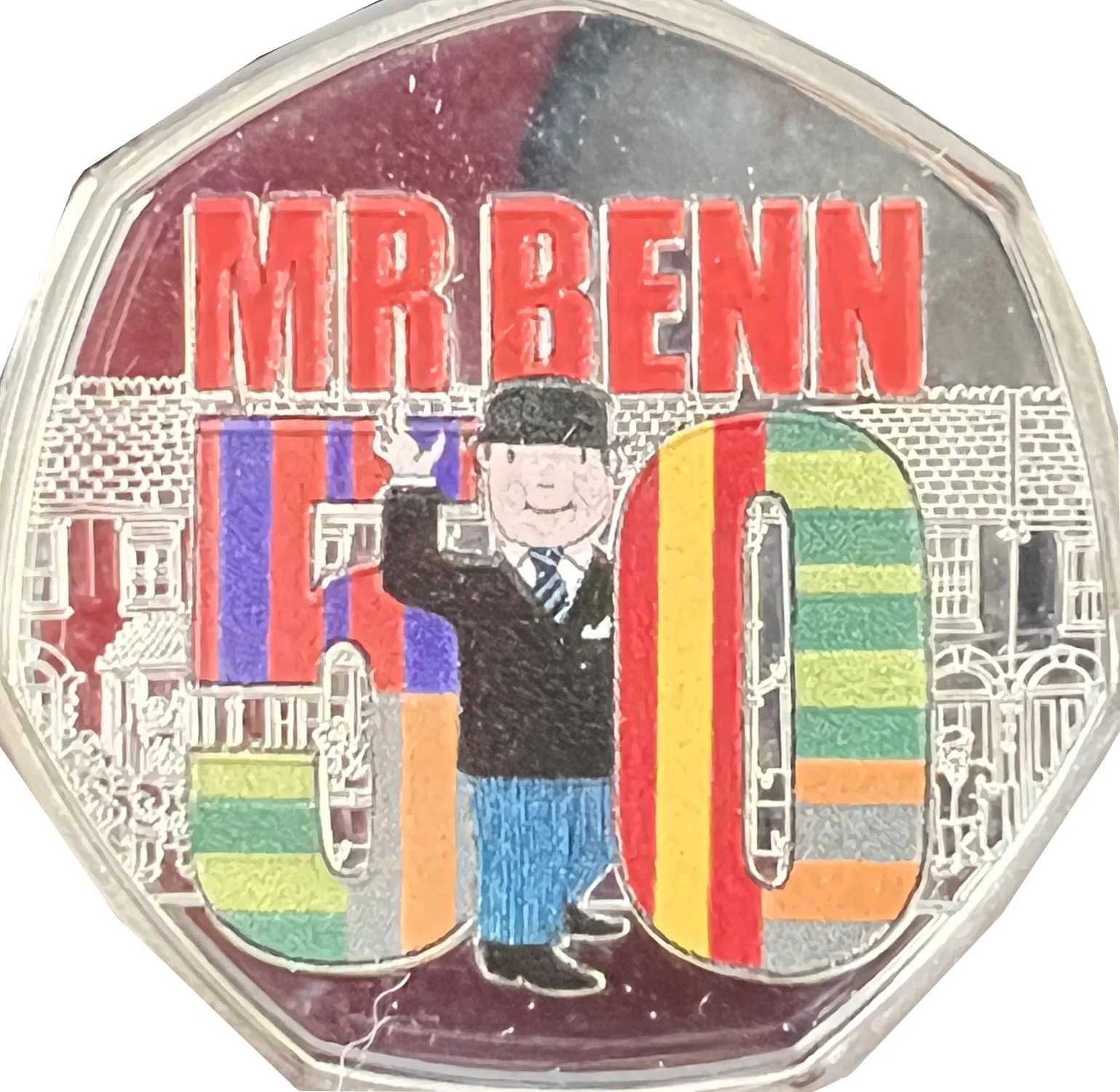 Mr Benn, colored red and wearing multicolored stripes, stands between the numbers 5 and 0 in front of a row of houses.