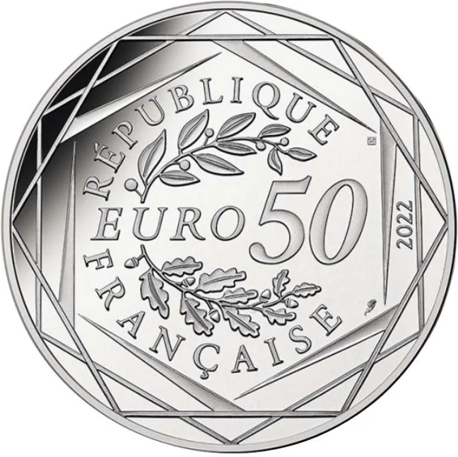 "50 EURO" flanked by laurel and oak branches, encircled by "RÉPUBLIQUE FRANÇAISE" and three hexagons.