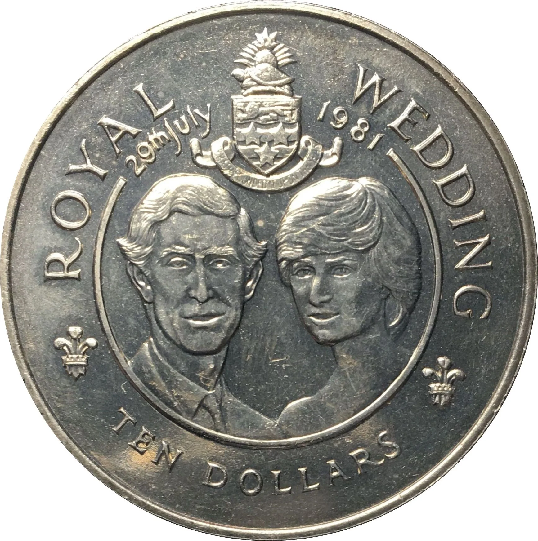 Beneath island crests, busts of Charles and Diana.