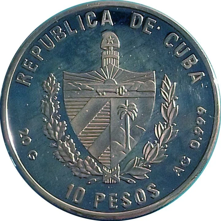 Cuban coat of arms with country name above, face value below, and weight and fineness on the sides.