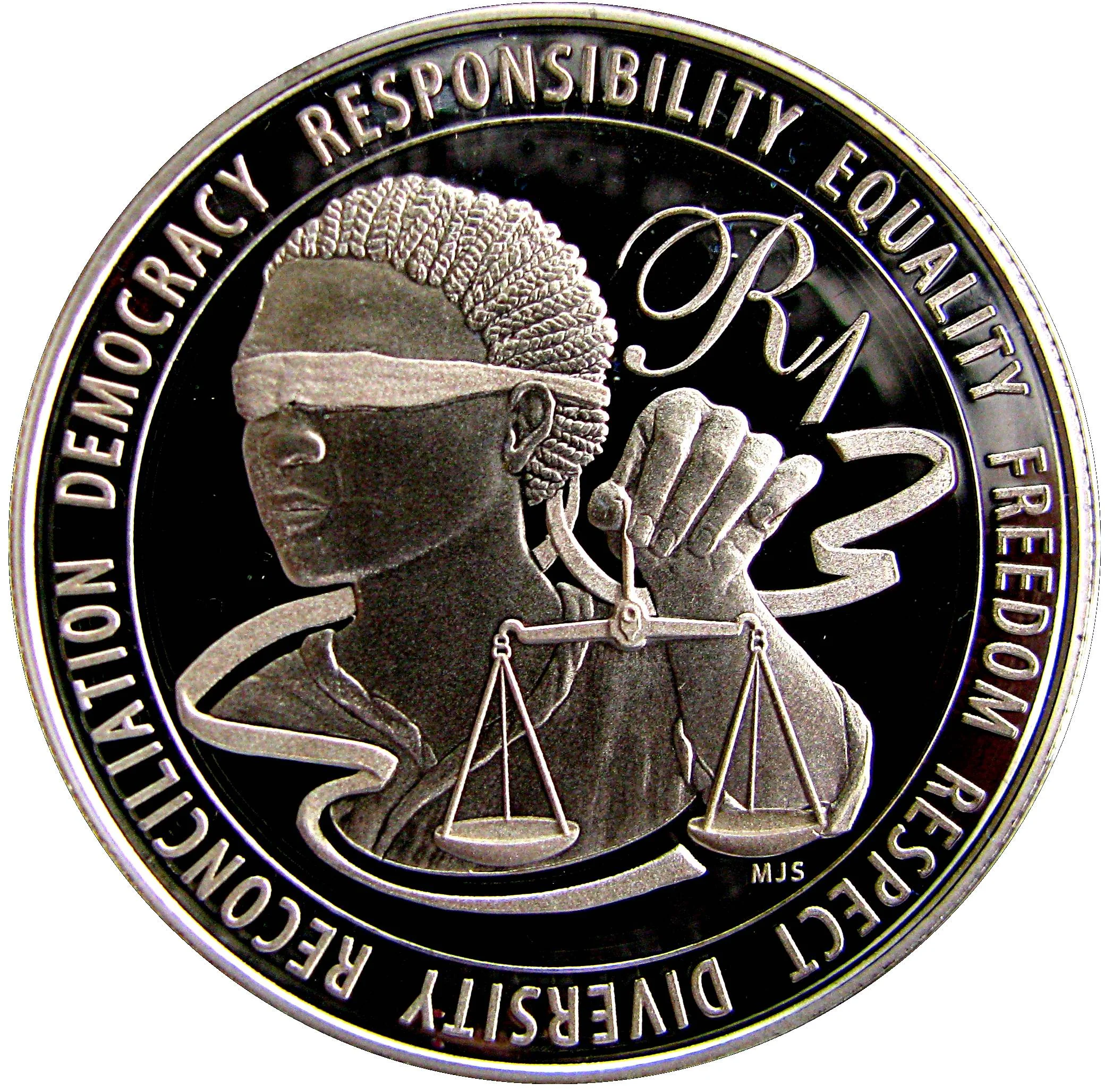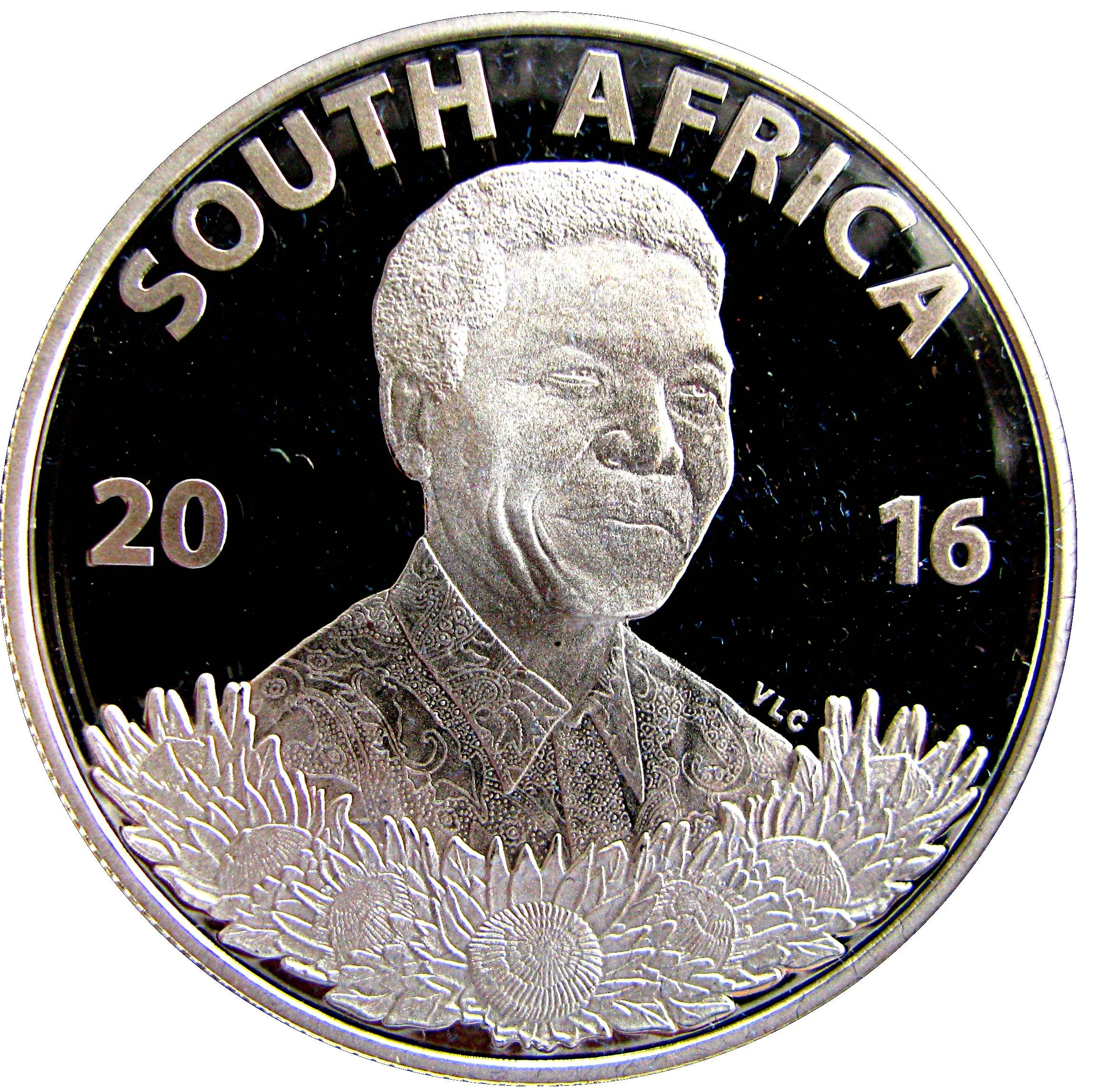 The obverse features Nelson Mandela alongside South Africa's national flower, the King Protea.