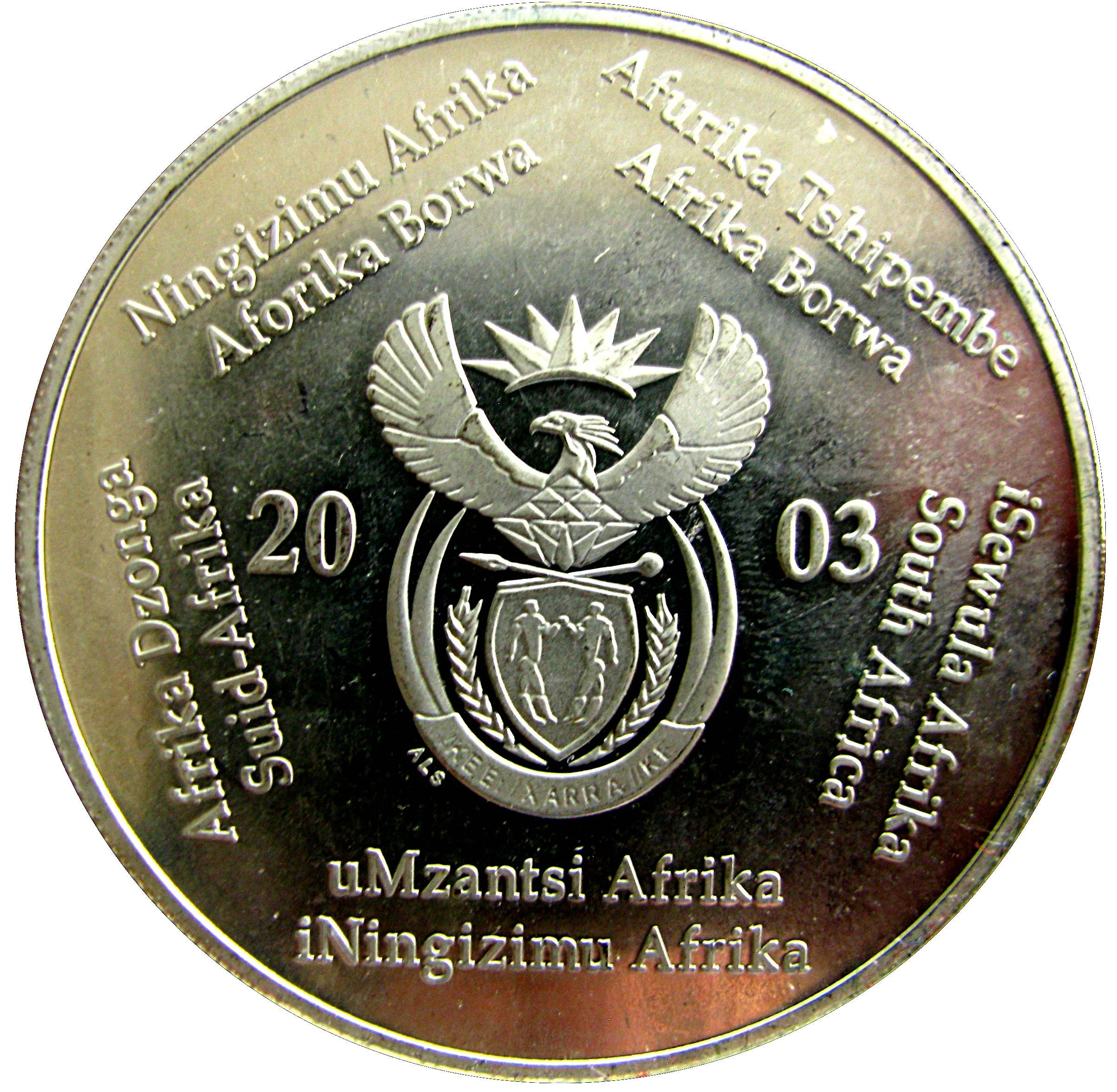 South Africa's coat of arms with its name in ten languages.