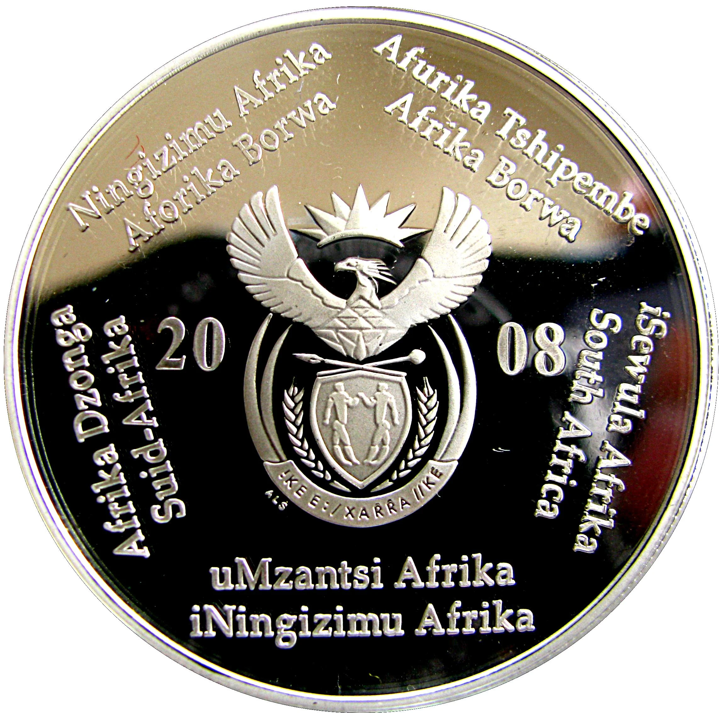 South Africa's coat of arms with its name in ten languages.