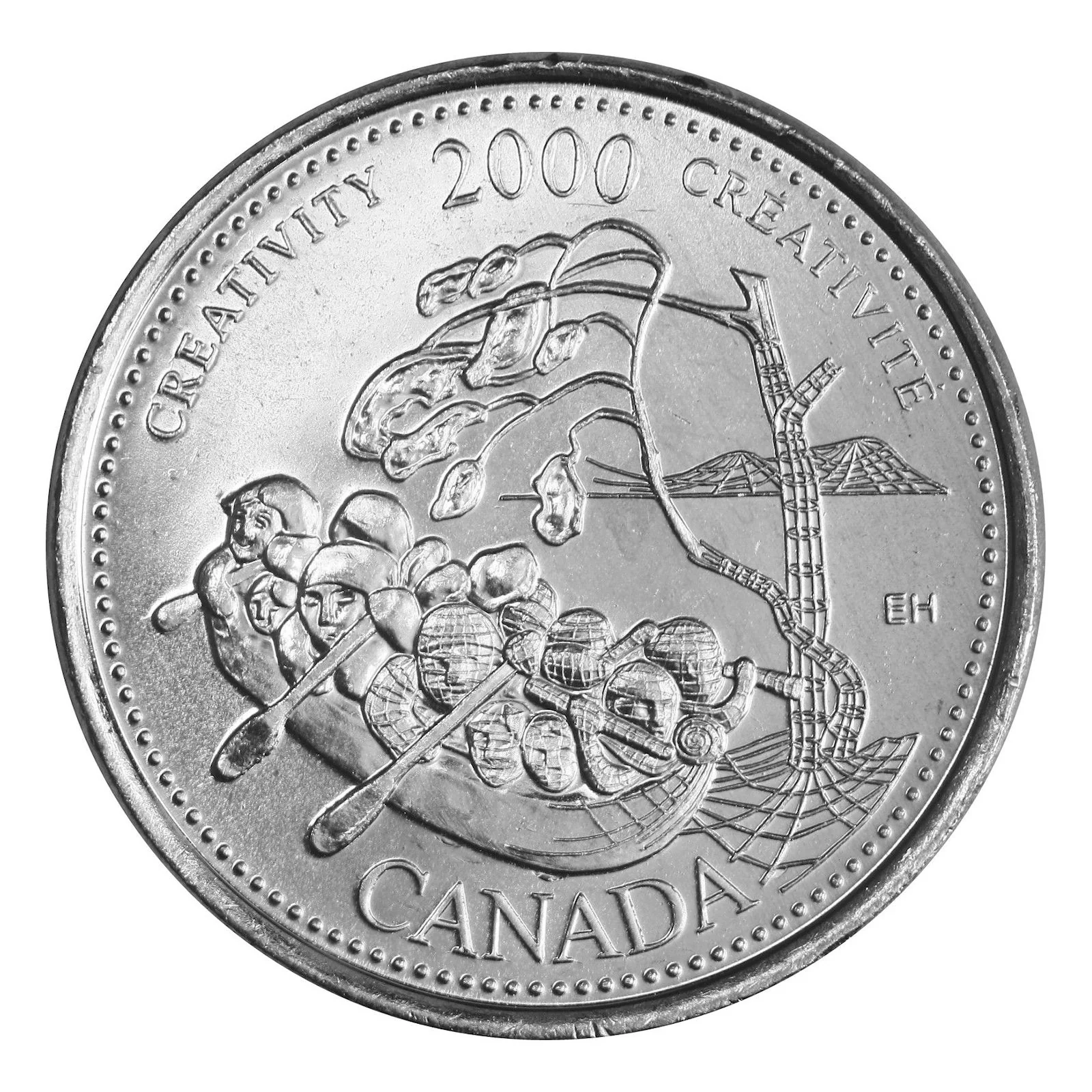 A scene blending three millennia of art: an Inuit boat left, a Group of Seven-style tree upper right, a wireframe landscape right, with "Creativity" in English and French flanking the date and country name.