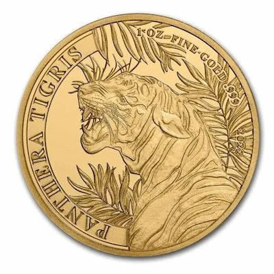 A side view of a tiger's head in the forest, roaring to show its teeth, with the year, purity, and weight.