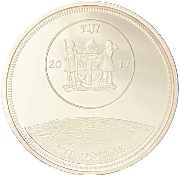 Apollo 11 Lunar Module on the Moon with a colored Earth, dark sky, and gold foil.