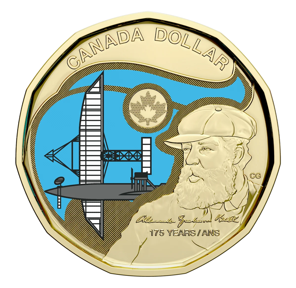 This colourized coin commemorates Alexander Graham Bell's 175th birthday. It features his signature, a later-life portrait, and schematics of his Silver Dart aircraft and HD-4 hydrofoil, both tested on the blue-highlighted waves of Bras d'Or Lake.