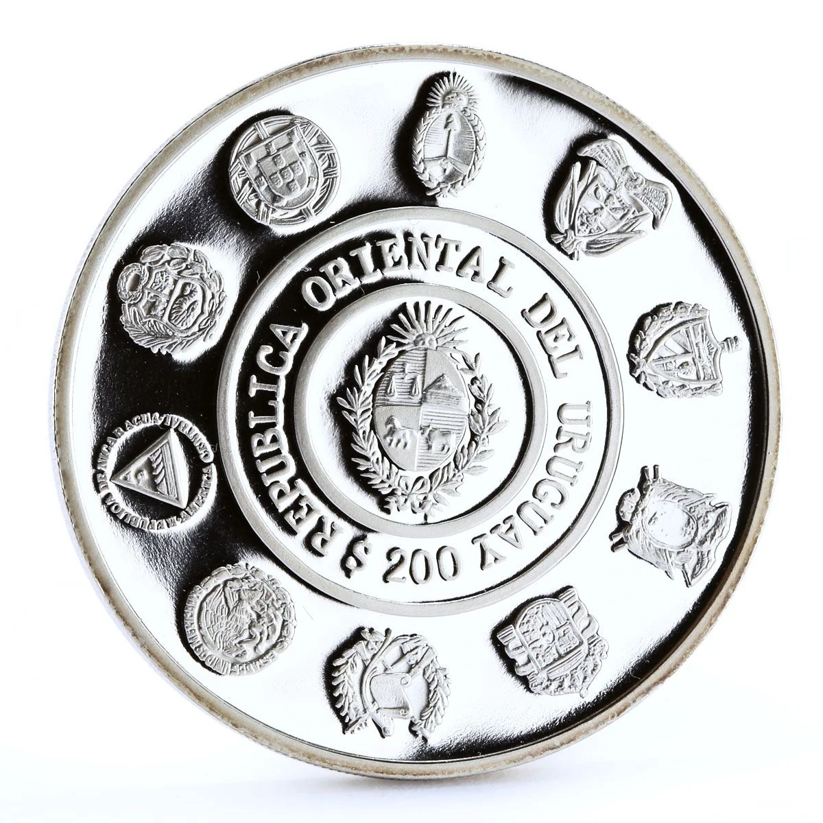 Uruguayan coat of arms at center, encircled by country name and surrounded by ten national coats of arms.