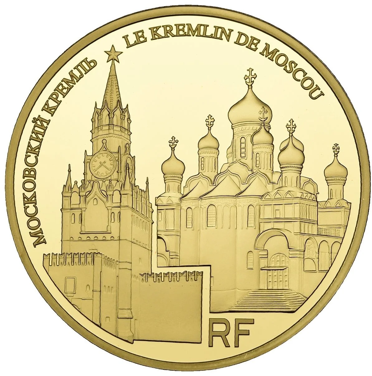 The Moscow Kremlin depicted by the Spasskaya Tower and Annunciation Church, with "RF" below. The edge reads "МОСКОВСКИЙ КРЕМЛЬ" and "THE KREMLIN OF MOSCOW" in Russian and French.