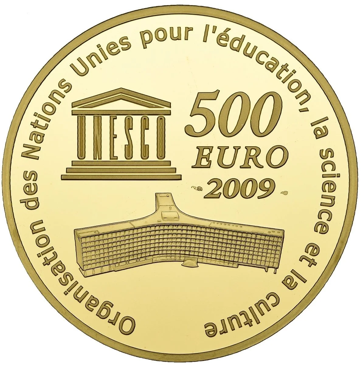 UNESCO headquarters and logo, with the organization's full name along the edge. The center features "500 EURO" and "2009."