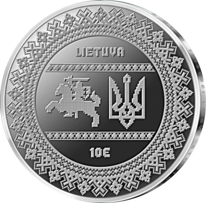Stylized Lithuanian and Ukrainian emblems, denomination below, artistic border.
