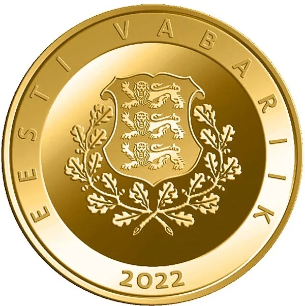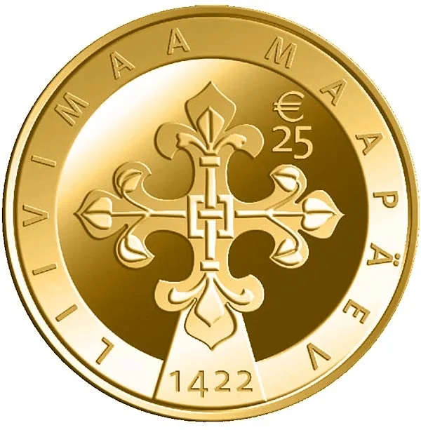 This coin features a cross adorned with leaves, inspired by a 14th-century carving in Karja Church. It symbolizes the steady growth of medieval Christianity and bears the year 1422 and the words "Liivimaa maapäev" (Livonian Diet).