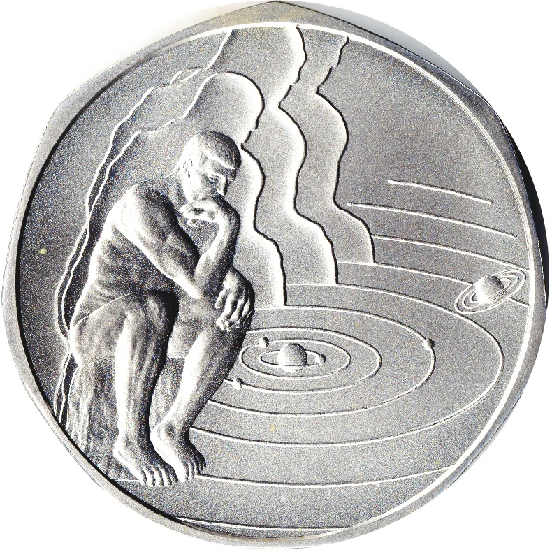 Rodin’s Thinker over water, four shades above waves, symbolizing the Universe.