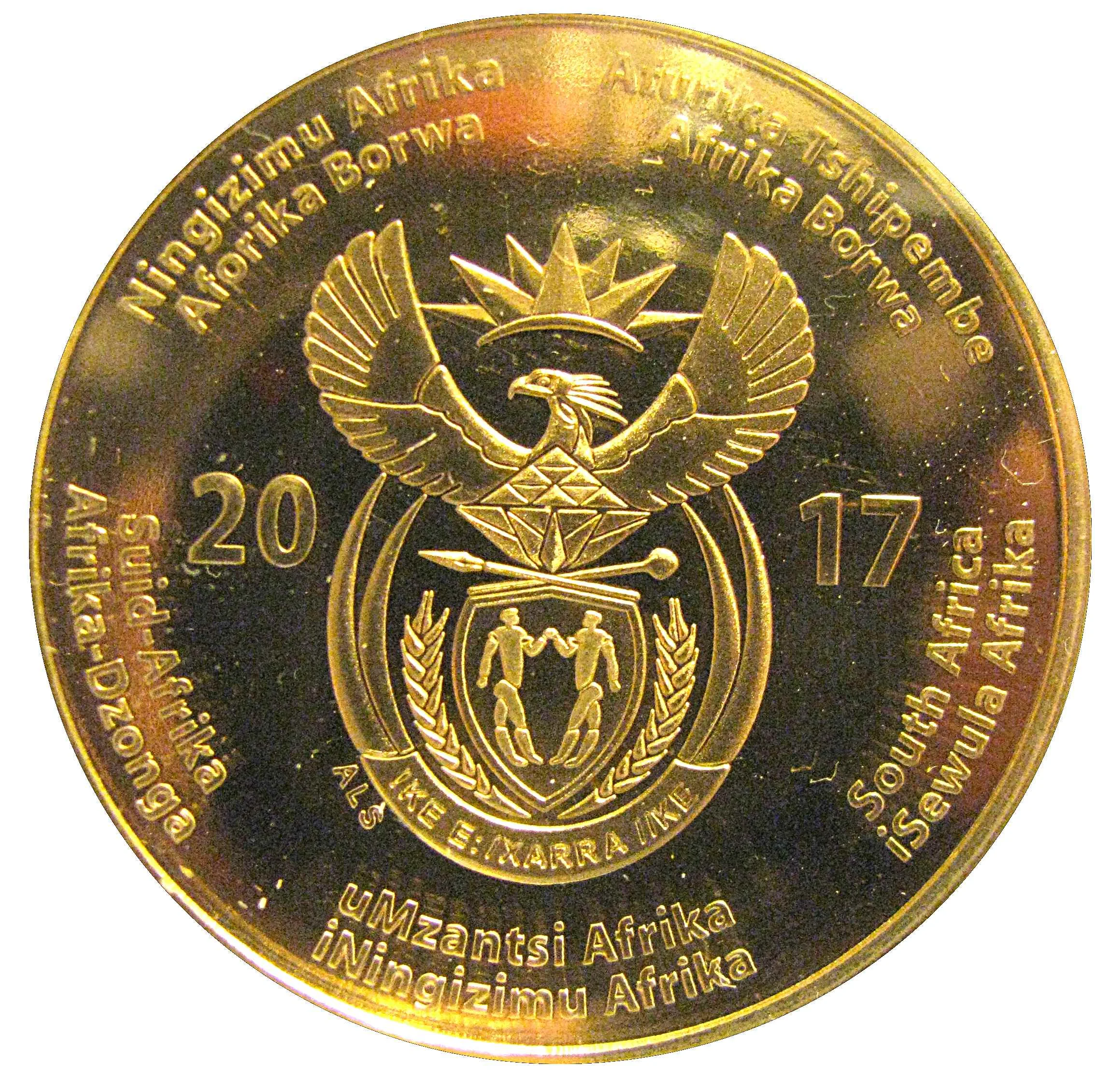 South Africa's coat of arms with its name in ten languages.