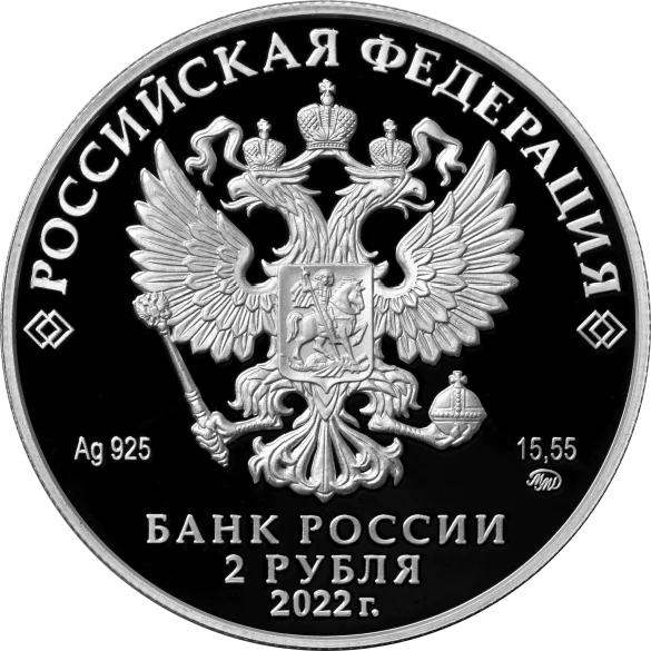 The obverse features the Russian coat of arms, inscriptions "РОССИЙСКАЯ ФЕДЕРАЦИЯ" and "БАНК РОССИИ", the denomination "2 РУБЛЯ", the year 2022, the metal's chemical symbol, fineness, mint mark, and fine metal content.