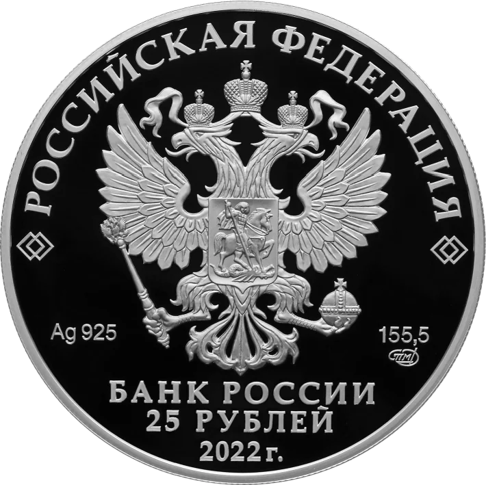 The obverse features the Russian coat of arms, inscriptions for "Russian Federation" and "Bank of Russia," the denomination "25 Roubles," the issue year "2022," the metal's chemical symbol, fineness, mint mark, and fine metal content.