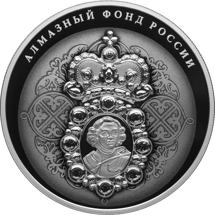 The reverse shows a laser-matte badge relief of Peter I against traditional ornament, encircled by ‘АЛМАЗНЫЙ ФОНД РОССИИ’.